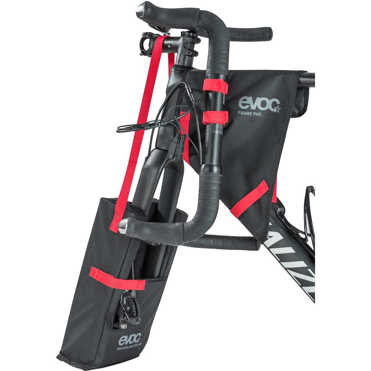 Om du ska frakta din kolfiberracer i Evocs cykeltransportväska bör du komplettera med detta set. Passar även landsvägscyklar med skivbroms. Passar till Evoc Bike Travel Bag och Travel Bag Pro. Används ej ihop med Bike Stand eller Roadbike Alu Stand.