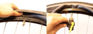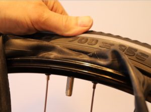 - Pumpa den nya slangen så att den blir rund. Stoppa i ventilen och för in slangen i däcket.