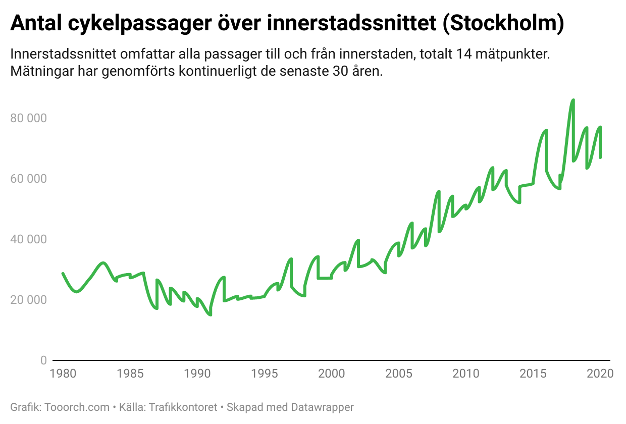 För stockholmarna ser vi en stor ökning i cykelpendling över tidens gång. Grafen nedan visar hur cykelpendlingen har utvecklas i Stockholms innerstad under de senaste 30 åren.
