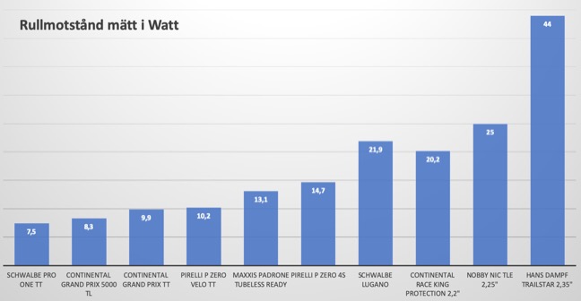 I nedanstående diagram kan man se rullmotståndet hos olika däck uppmätt enligt ovanstående metod. Man kan se att det är stora skillnader inom gruppen landsvägsdäck, och det sämsta landsvägsdäcket har ett sämre rullmotstånd än det snabbaste XC-däcket (förvisso ett bakdäck - men ändå).