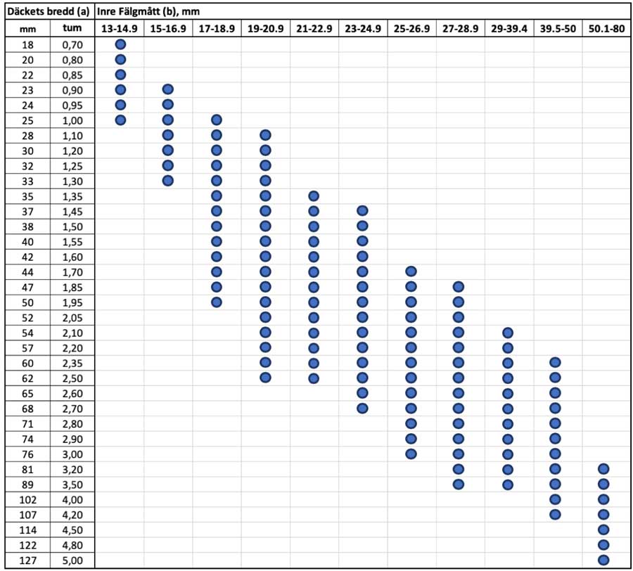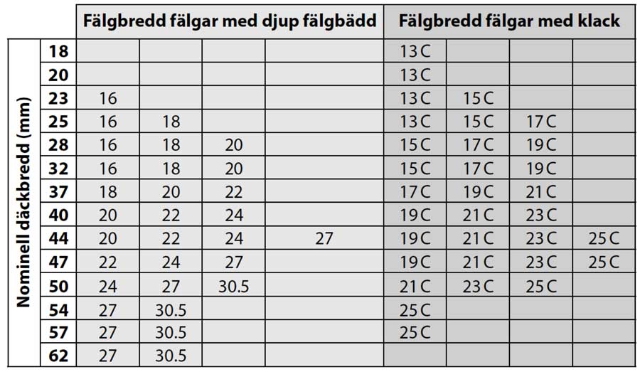 De flesta fälgtillverkare uppger vad som är rekommenderade bredder på däcken - så börja alltid med att kolla fälgtillverkarens hemsida. Det är dock inte alltid det ger napp. I så fall kan nedanstående tabell fungera som en fingervisning.